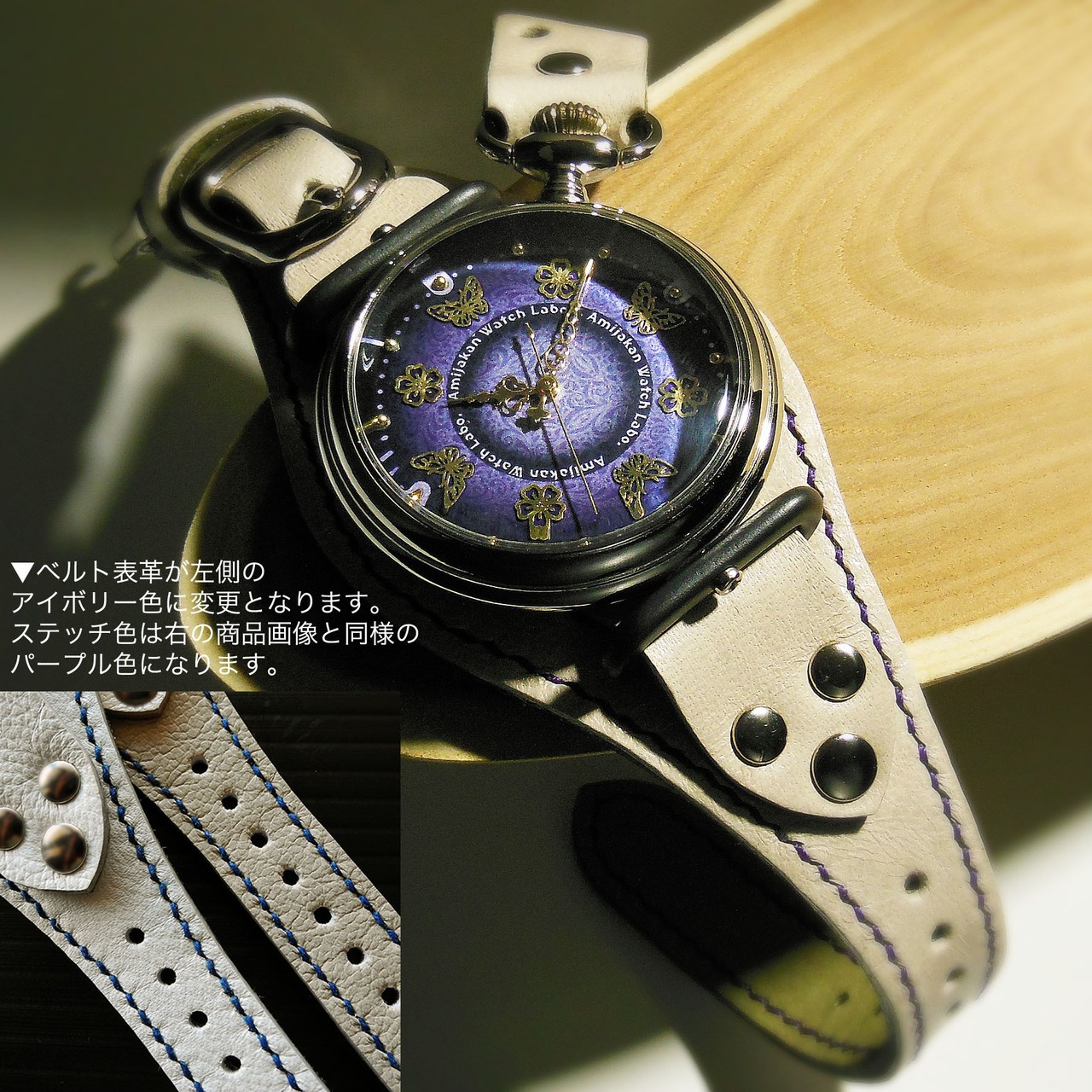 夜光蘭/アイボリーカラー×パープルステッチ。